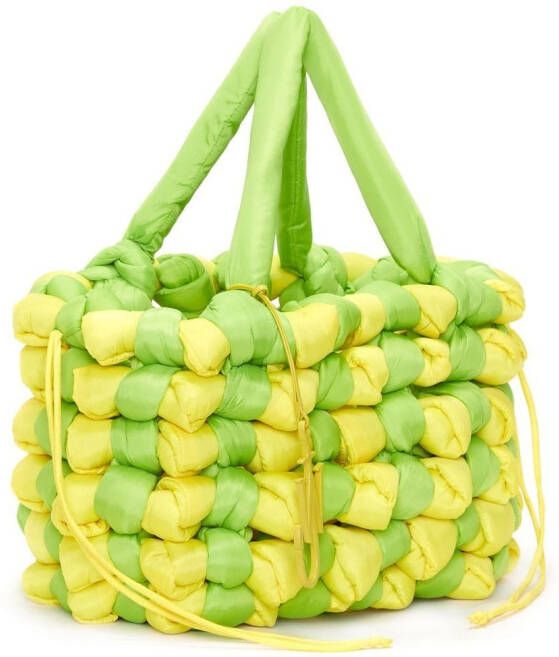 Neongroen, kanariegeel, gewatteerd design, tweekleurig design, ronde handvatten, trekkoordsluiting en hoofdvak.