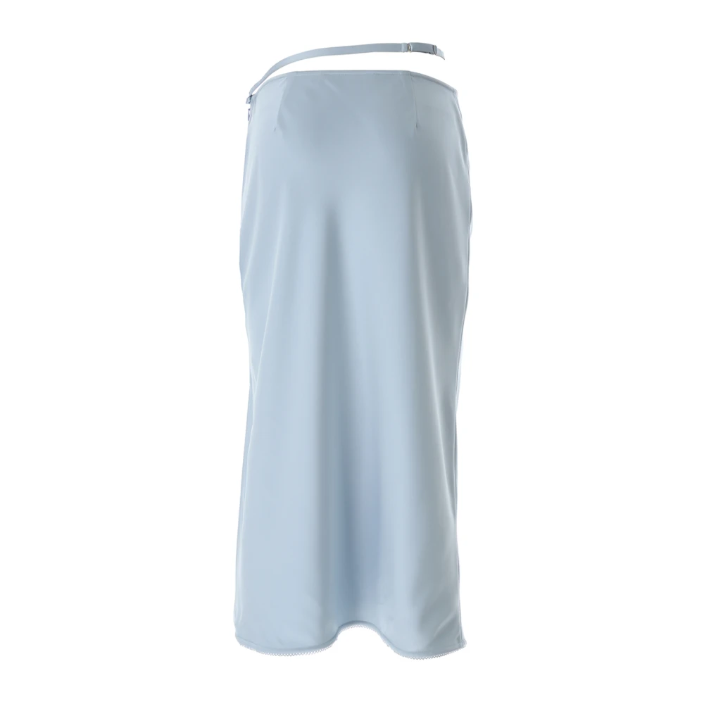 Verrijk je stijl met deze moderne en verfijnde Karl Lagerfeld midi-rok in blauw satijn. Met een zijwaartse split en een bijpassende verstelbare stoffen riem met zilveren bedel.