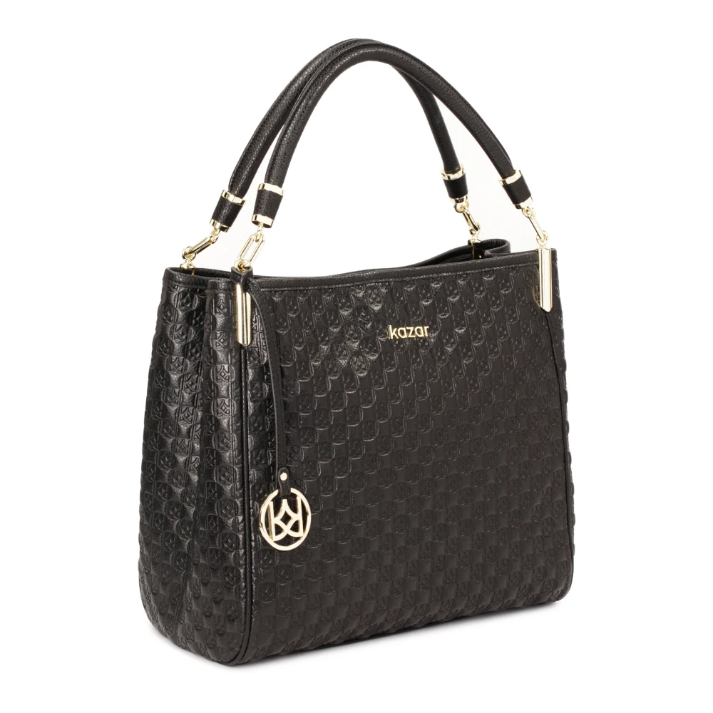 Dameshandtas gemaakt van hoogwaardig graanleer is een ruim en zeer praktisch model, dat nuttig zal zijn in veel verschillende situaties. Zacht en aangenaam aanvoelend leer maakt het gebruik van deze handtas uiterst comfortabel. De eenvoudige, minimalistische snit krijgt een elegante uitstraling door regelmatig gerangschikte KAZAR-monogrammen en gouden elementen, die perfect passen bij het zwarte leer. Productdetails: De handtas heeft een hoofdcompartiment dat gesloten is met een rits. In het hoofdcompartiment bevinden zich 2 open en 1 met rits afsluitbare compartimenten. Aan de binnenwanden van de tas bevinden zich 2 open en 1 met rits afsluitbare zakken. De achterkant van de handtas is voorzien van 1 met rits afsluitbare zak. Aan de onderkant van de tas bevinden zich metalen voetjes.