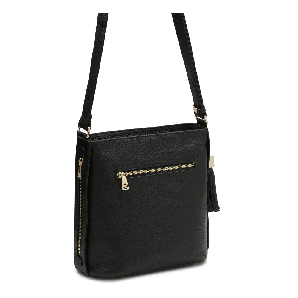 Zwarte messenger-tas gemaakt van hoogwaardig graanleer is een klassiek, tijdloos model perfect voor dagelijks gebruik. Talrijke zakken, eenvoudige vorm en universeel zwart maken deze tas een onmisbare toevoeging aan stedelijke styling. Ongetwijfeld zal het worden gewaardeerd door elke vrouw die een actieve levensstijl leidt. Naast gemak en functionaliteit onderscheidt de tas zich door zijn stijlvolle uitstraling. De damestas heeft: 1 hoofdcompartiment afgesloten met een rits. Binnenin het compartiment 2 open zakken en 1 met rits. Aan de zijkanten 2 zakken met ritsen. Aan de achterkant 1 zak met rits. Decoratieve tang aan het rits-handvat. Verstelbare riem.