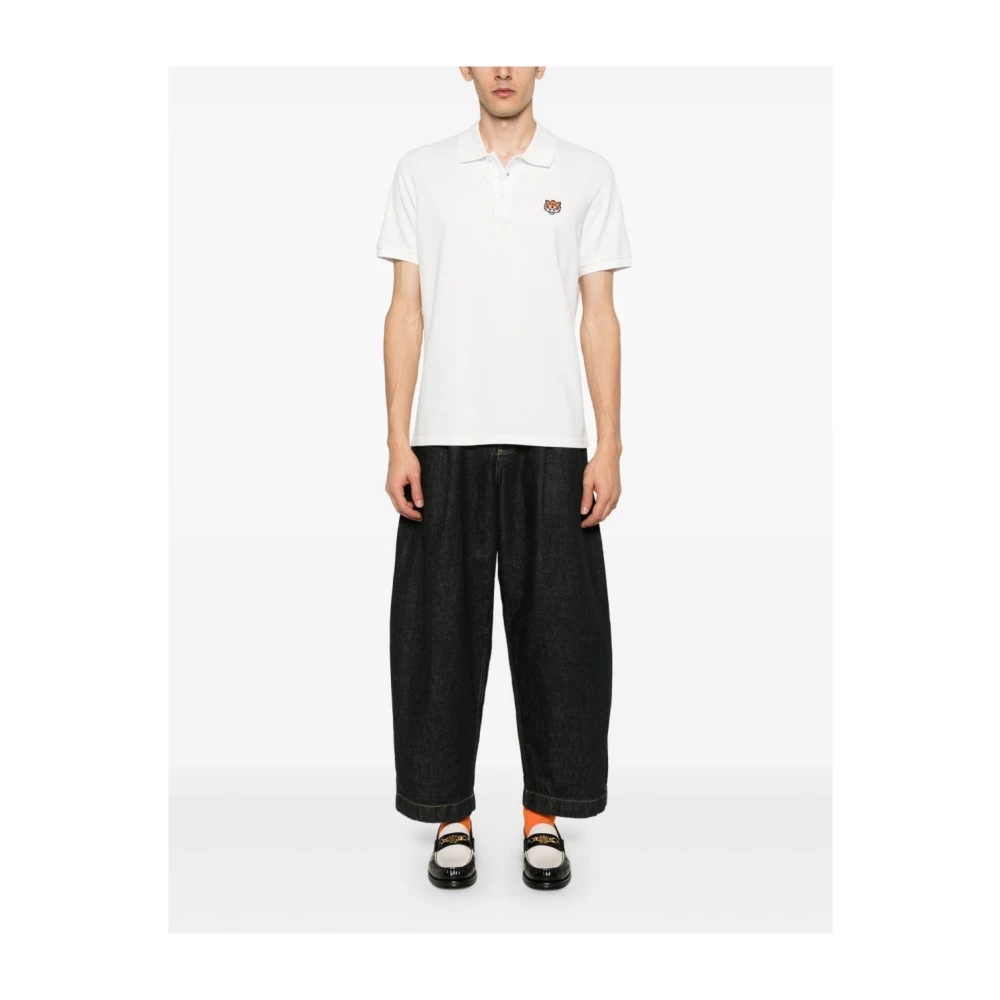 Kenzo off-white katoenen piqu geweven geribbelde polo shirt voor heren, met korte mouwen met geribbelde afwerking, geborduurd logo op de mouw, kenmerkende Tiger Head patch op de borst, rechte zoom, en korte knoopsluiting aan de voorkant.