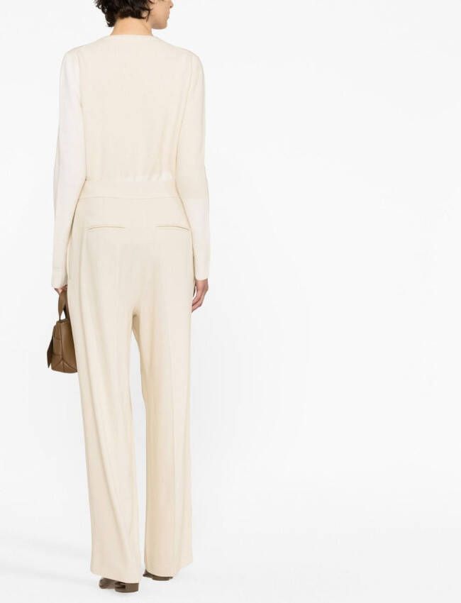 Crmewit, high waist, verborgen sluiting aan de voorkant, twee ingenaaide zijzakken, twee paspelzakken aan de achterkant, geperste vouw en wijde pijpen.