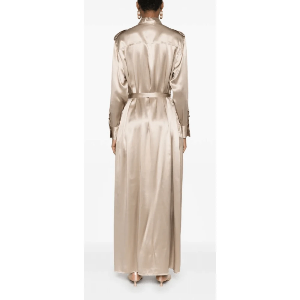 Upgrade je stijl met deze luxueuze Kiton maxi-jurk in lichtbruine zijde. Voorzien van een satijnen afwerking, verborgen knoopsluiting aan de voorkant, klassieke kraag, epauletten en lange mouwen met knoopmanchetten. Compleet met twee borstzakken met knoopsluiting, ceintuurlussen, afneembare tailleband, zijsplitten en een rechte zoom voor een verfijnde uitstraling. Model is 1, 8 m lang en draagt maat 40 (It).