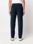 Blauw, katoen, ribfluweel, elastische tailleband, knoopsluiting, twee paspelzakken aan de achterkant en straight-fit.