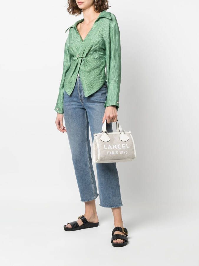 Logoprint op de voorkant, leren afwerking, ritssluiting aan de bovenzijde, twee ronde handvatten en hoofdvak.