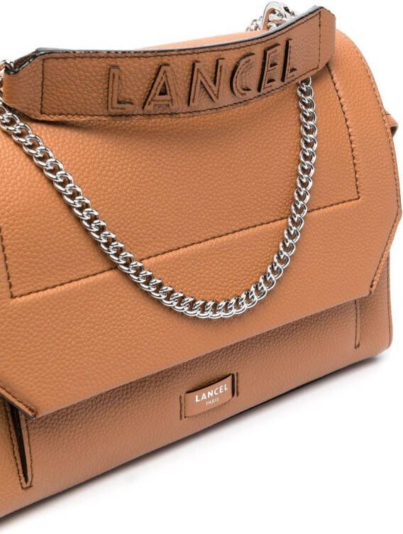 Bruin, kalfsleer, omslag, logopatches aan de voorkant, leren handvat met schakels, afneembare leren schouderband met schakels, binnenvakken met ritssluiting en hoofdvak.