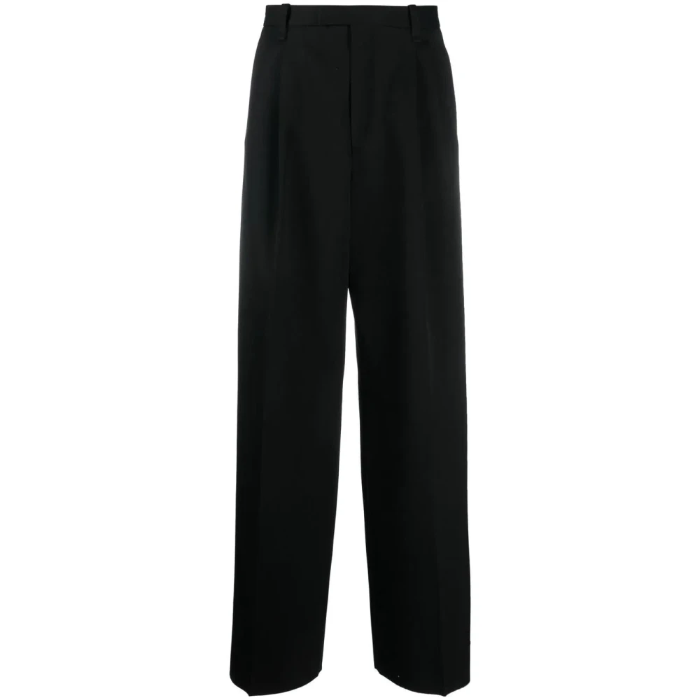 Zwart, wol, geplooide details, riemlussen, verborgen sluiting aan de voorkant, twee steekzijzakken, paspelzak aan de achterkant en achterzak met klep.