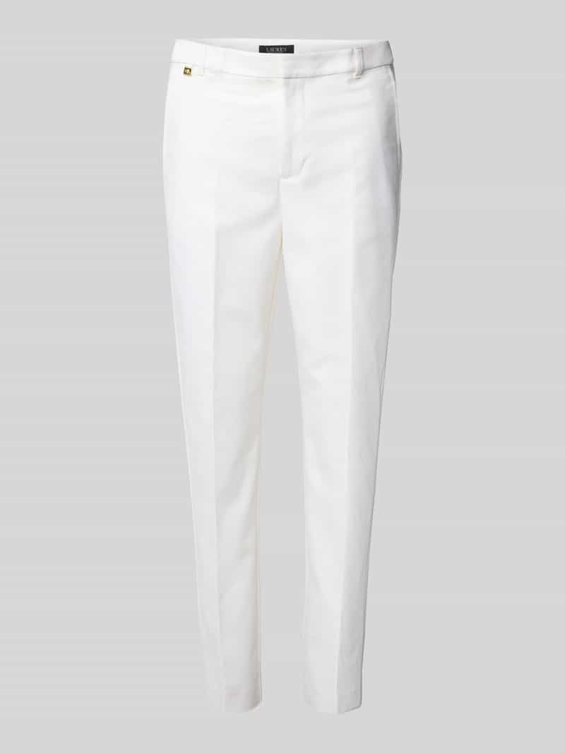 Damesbroek van Lauren Ralph Lauren. Mix van katoen en elastaan. Slim fit. Model 'LAKYTHIA'. Effen design. Labelapplicatie. Persplooien. Haak- en ritssluiting. Steekzakken opzij. Bandwijdte bij maat 36: 38 cm. Binnenbeenlengte bij maat 36: 71 cm