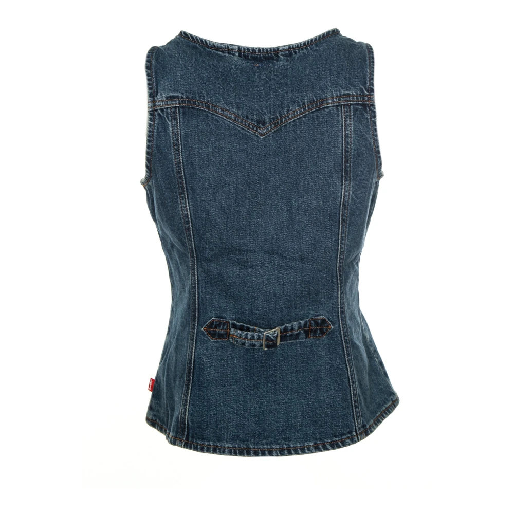 Upgrade je stijl met deze Levi's denim vest voor vrouwen. Gemaakt van zacht katoen, deze mouwloze vest heeft een V-hals in korsetstijl. Het sluit met een rij metalen knopen gegraveerd met het logo en heeft korsetnaden aan de voor- en achterkant. De verstelbare band aan de achterkant en twee nepzakken aan de voorkant voegen een vleugje stoere uitstraling toe.