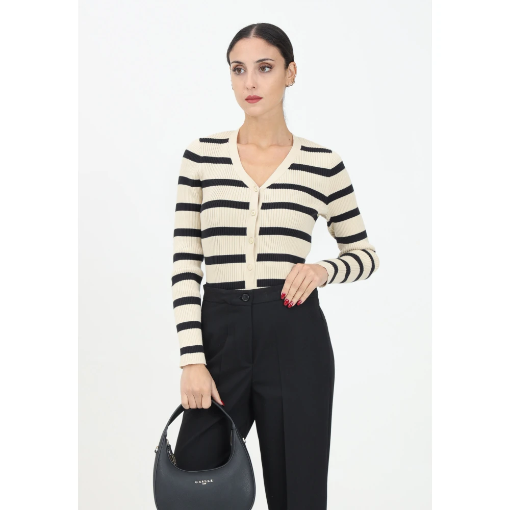 Levis Cardigan Tulip beige en zwart voor dames. Een beetje top, een beetje trui... en absoluut jaren 90. De Tulip cardigan heeft een V-hals, knopen aan de voorkant en een slanke pasvorm die de vorm benadrukt. Het model draagt maat S en is 170 cm lang. Wassen en strijken op gemiddelde temperatuur wordt aanbevolen. Herfst winter seizoen. Beige dames korte cardigan regular fit herfst winter A8895-00040004
