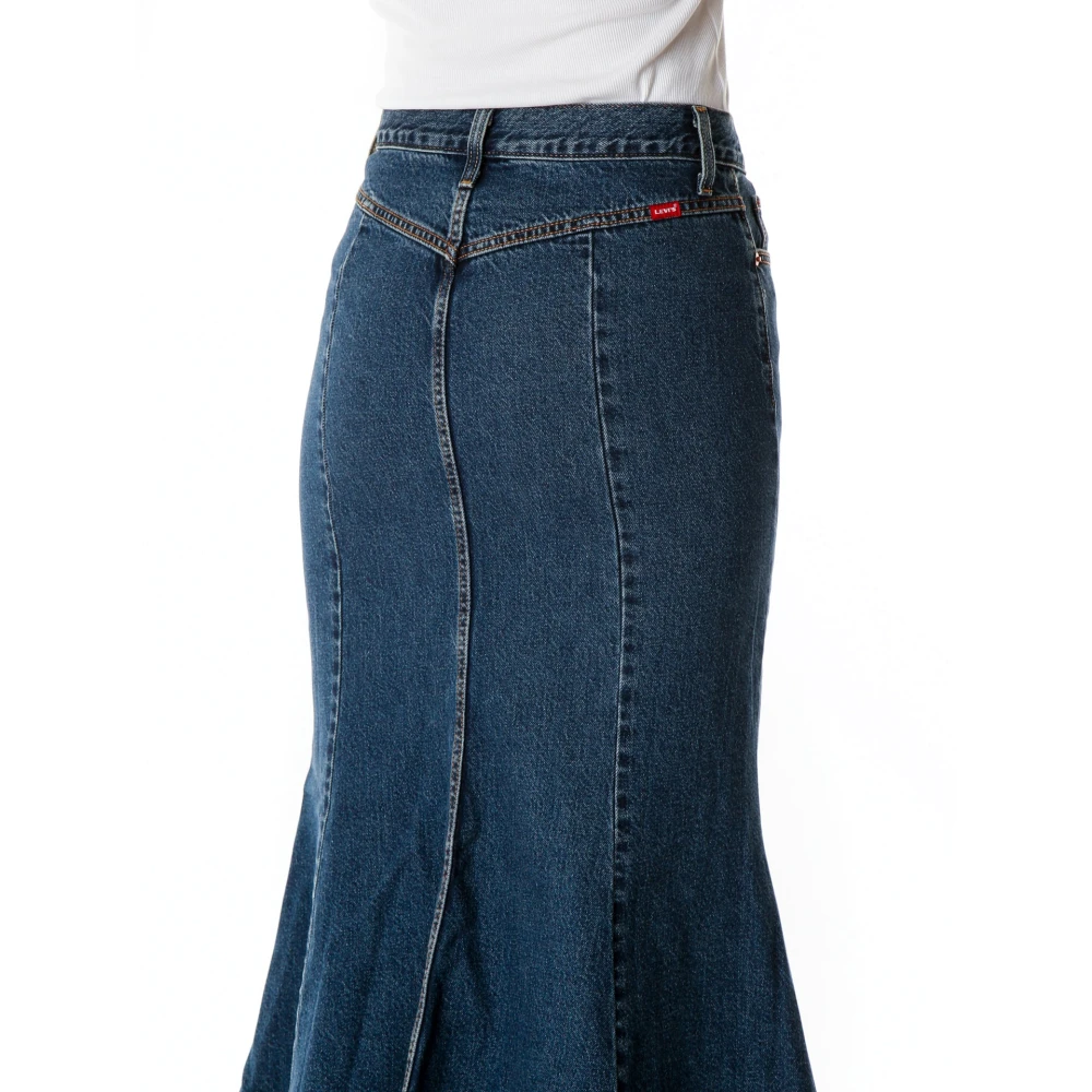 Jeansrok van Levi's. Puur katoen. Uitlopend model. Maxirok. Model 'MERMAID'. Riemlussen. Steekzakken opzij. Bandwijdte bij maat 27: 38 cm. Totale lengte bij maat 27: 104 cm