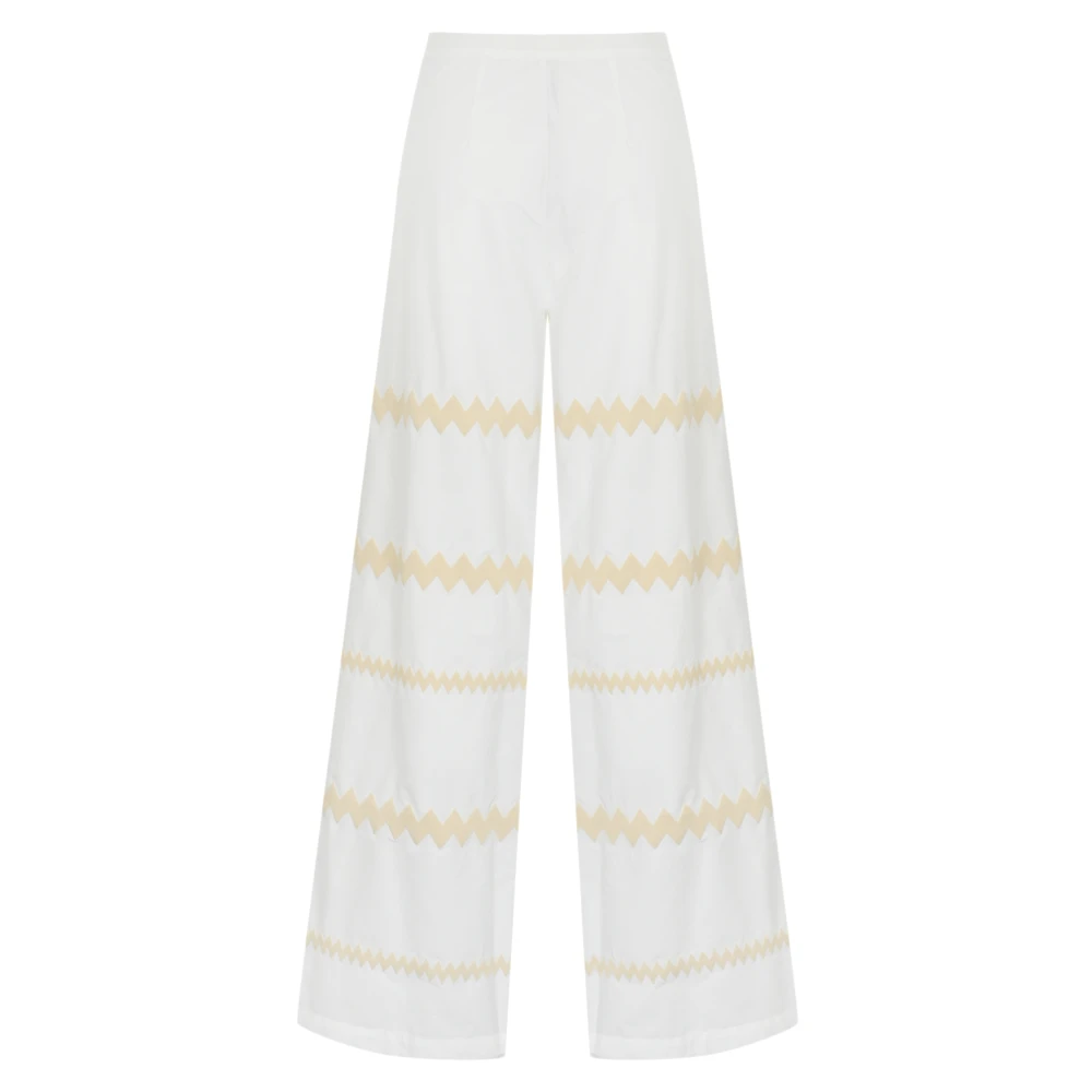 Liviana Conti dameskatoenen broek: Katoen popeline Elastische taille Contrasterend zigzagborduurwerk Wijde pijpen Normale pasvorm Samenstelling: 64% katoen, 31% polyamide, 5% elastaan.