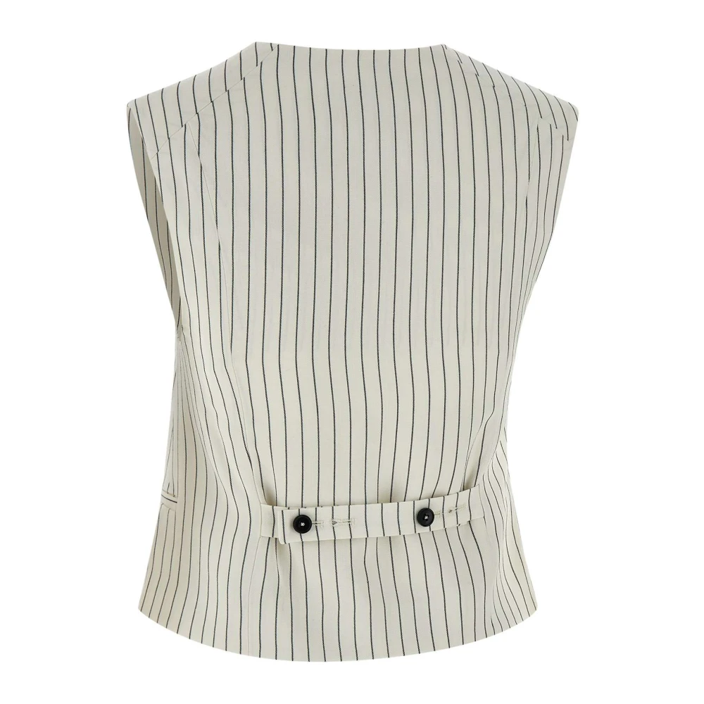 Upgrade je stijl met Loulou Studio's 'Vanua' dames linnen en viscose vest. Dit crmekleurige vest heeft een pinstripe patroon met zwarte strepen, een V-hals, enkele rij knoopsluiting, contrasterende kleur knoopsluiting, viscose voering, achterband en een regular fit.