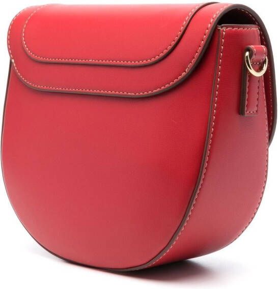 Rood, goudkleurig materiaal, goudkleurig logo, omslag met drukknoopsluiting, afneembare en verstelbare schouderband, hoofdvak en logo-relif aan de binnenkant.