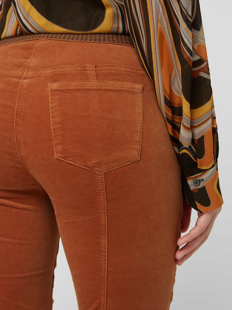 Damesbroek van Luisa Cerano. Katoenmix met modal. Skinny fit. Fluweel. Taille met elastische inzet. Knoop- en ritssluiting. 5-pocketdesign. Gerafelde pijpboorden. Opgestikte achterzakken. Binnenbeenlengte bij maat 36: 72 cm. Bandwijdte bij maat 36: 69 cm