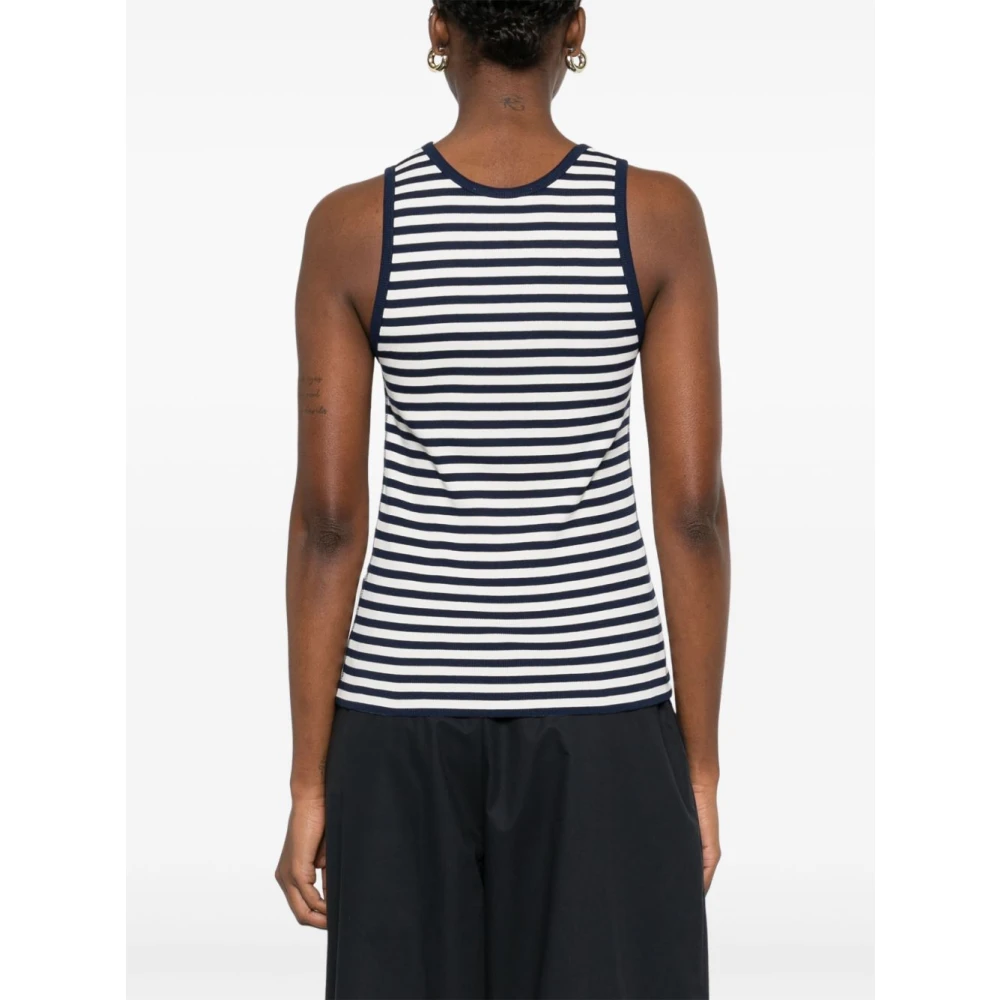 Upgrade je stijl met deze navy blauwe scoop neck mouwloze top van Maison Kitsun. Met een chique horizontaal streepjespatroon past dit stuk precies op maat. Model is 1, 75m / 5ft 8in en draagt maat S
