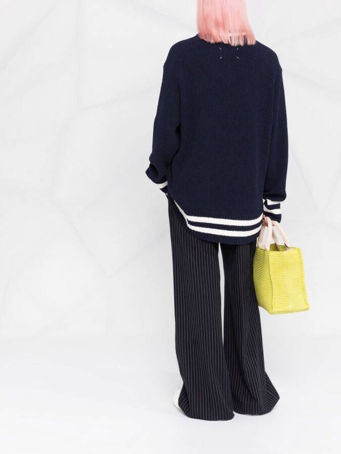 Ribgebreid, geborduurde bloemen op de voorzijde, kenmerkend logo, gestreept detail, V-hals, verlaagde schouders, lange mouwen en rechte zoom. Materiaal: gemixt katoen.