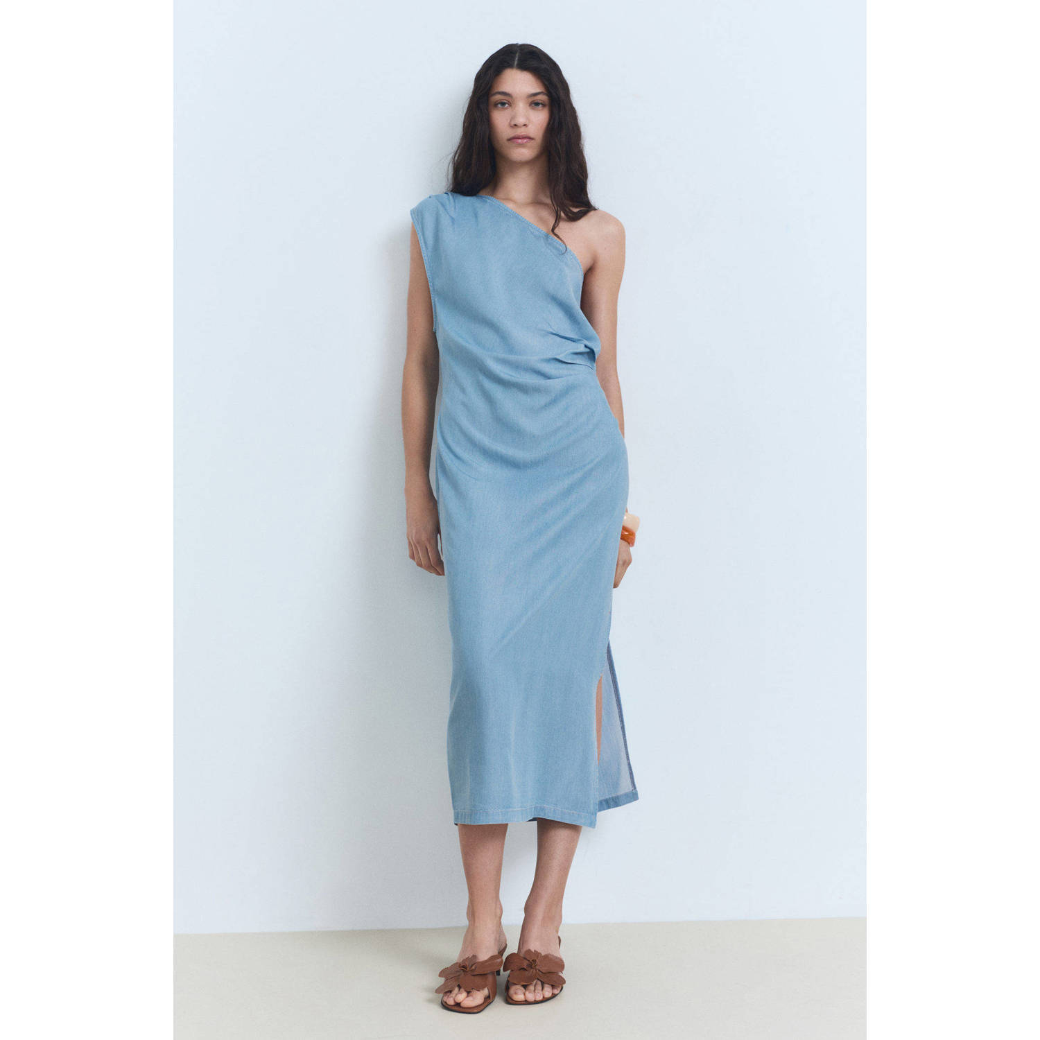 Deze jurk is van Mango. Deze midi-jurk is mouwloos en gemaakt van denim. De ritssluiting zit aan de zijkant, de jurk heeft een one-shoulder kraagvorm, asymmetrische details, plooien en een split.