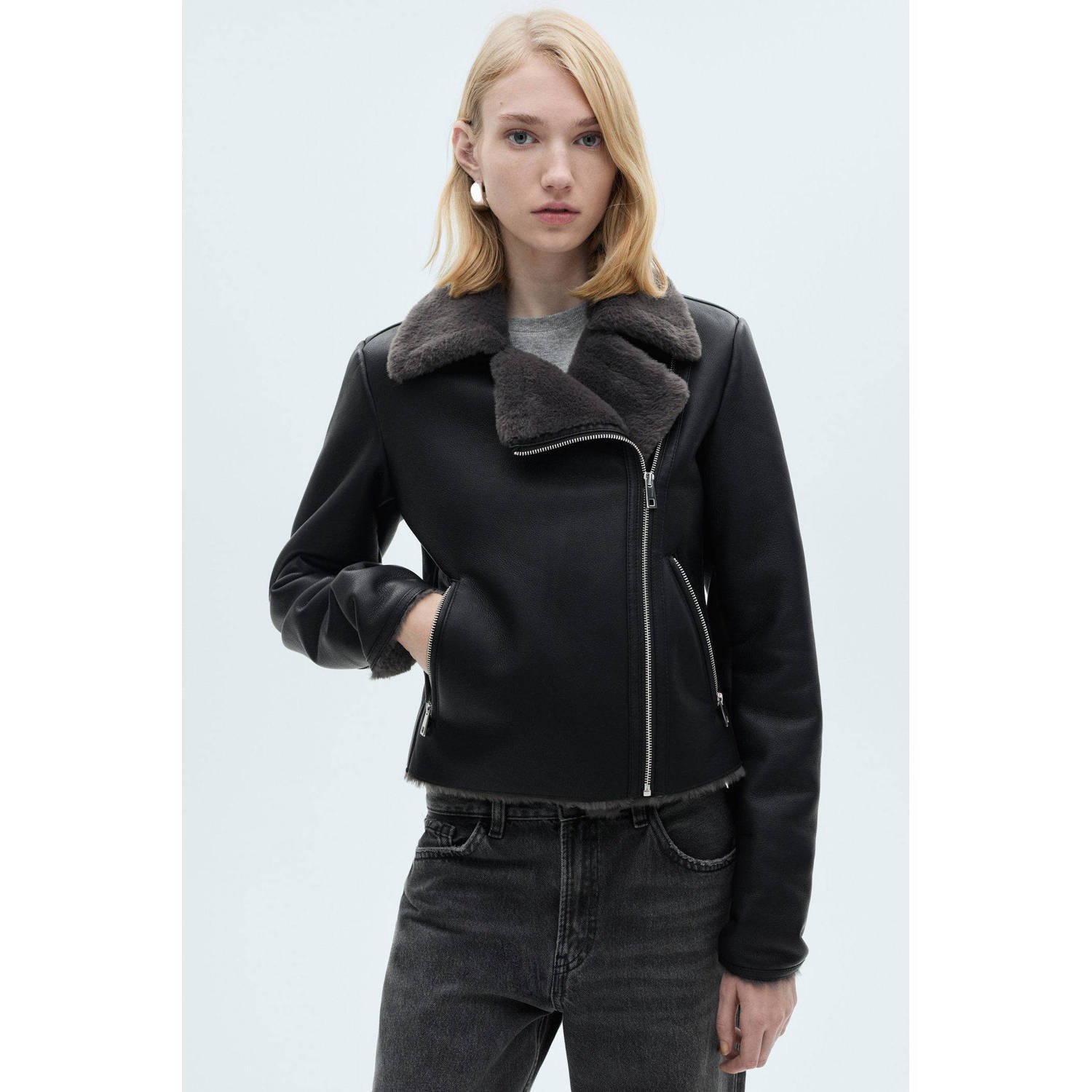 Deze damesjas van Mango komt in een stijlvolle zwarte kleur. Het imitatieleer en de lange mouwen maken deze jas perfect voor de winter. Met een reverskraag, ritssluiting en zijzakken biedt deze jas zowel stijl als gemak.
