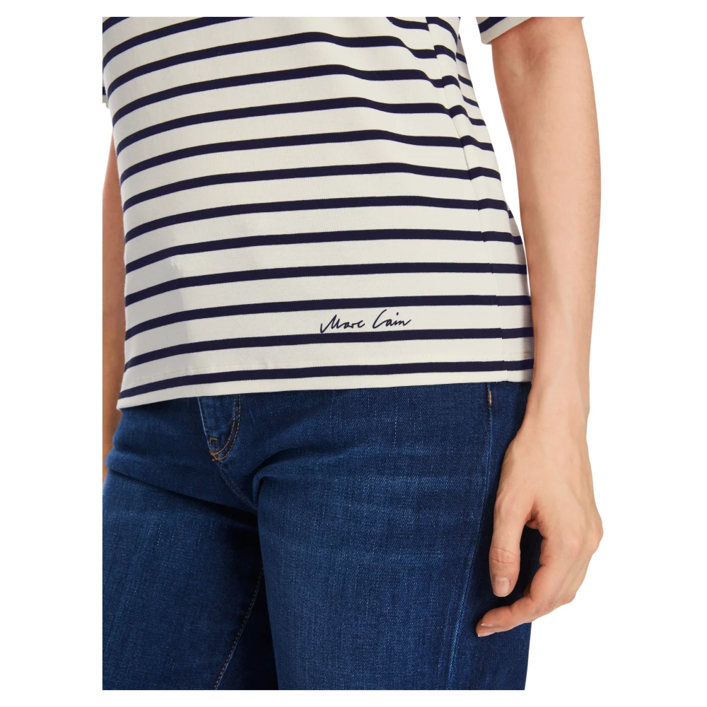Upgrade je casual look met deze Marc Cain T-shirt met maritieme strepen. De relaxte stijl heeft een getailleerde pasvorm, ronde halslijn en halflange splitmouwen. Gemaakt in Europa van een comfortabele katoen-stretchmix. Model is 179 cm lang en draagt maat N3/38.
