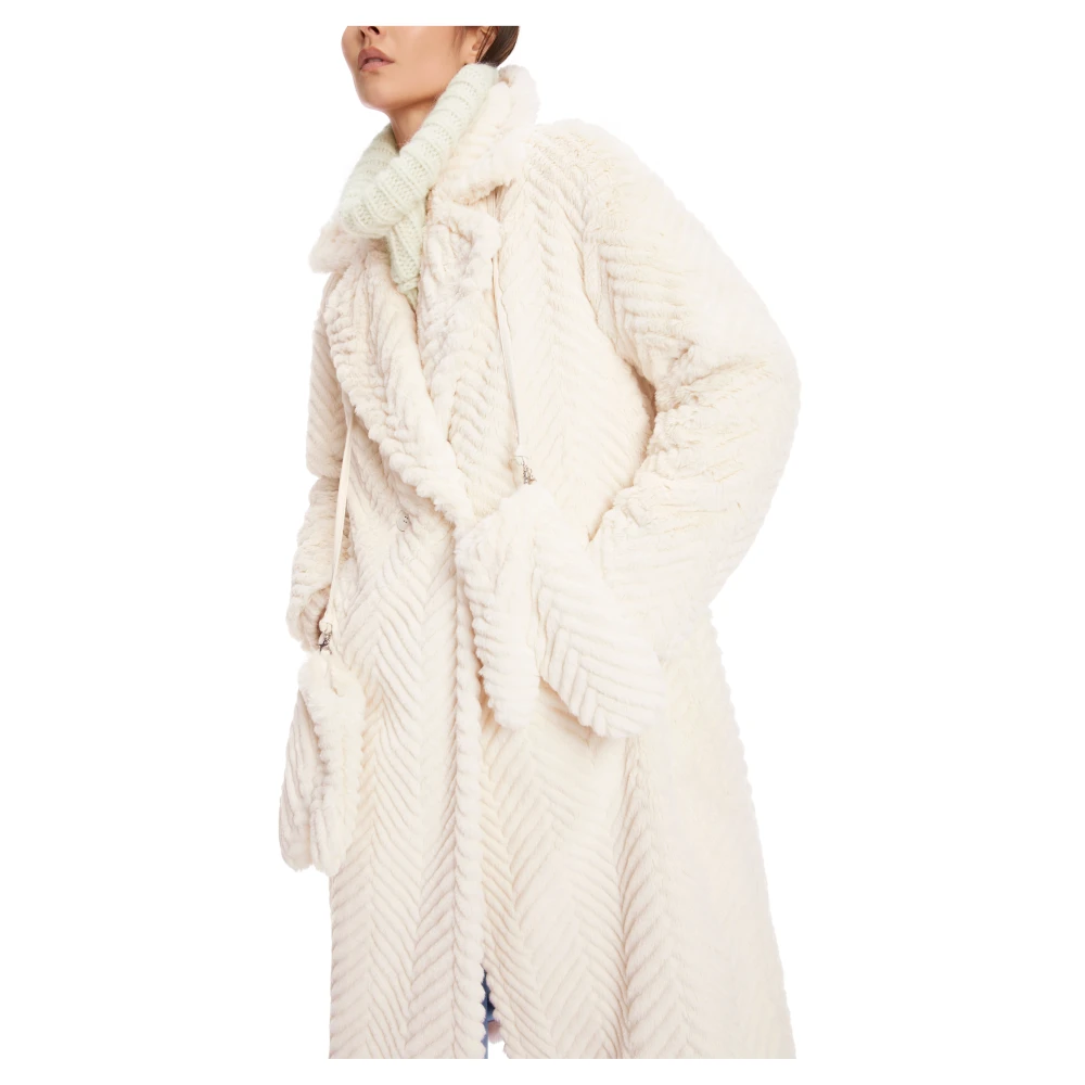 Upgrade je wintergarderobe met deze Marc Cain double-breasted jas. Gemaakt van Fun Fur in een visgraatpatroon, deze lange jas heeft een zachte vloeiende stof en een relaxte wijde pasvorm. Het opvallende designelement is de brede revers die leidt naar een dubbele knoopsluiting. Verticale naadzakken zijn subtiel verborgen in de vacht. Contrasterende voering voegt een stijlvolle touch toe. Model is 179 cm lang en draagt maat N3/38.