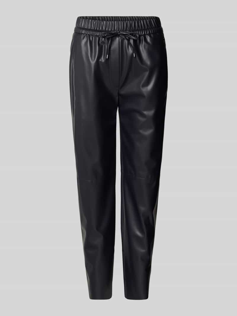 Stoffen damesbroek van Marc Cain. Materiaalmix. Los model. Leerlook. Elastische band. Tunnelkoord. Labeldetail. Franse steekzakken. Bandwijdte bij maat 36: 37 cm. Binnenbeenlengte bij maat 36: 69 cm