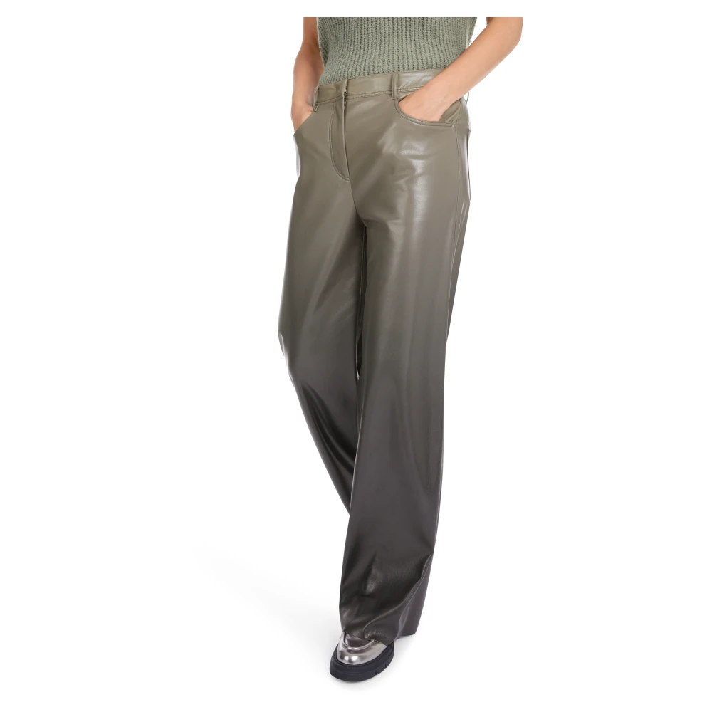 Upgrade je stijl met deze wijde broek van Marc Cain uit de Warri collectie. Gemaakt van glanzend Fun-Leather, voegen deze gecoate broeken een vleugje luxe toe aan het casual Four-Pocket design. Met een wijde snit en extra lange benen met rafelranden, bieden deze broeken zowel stijl als comfort met een hoge taille. Model is 179 cm lang en draagt maat N3/38.