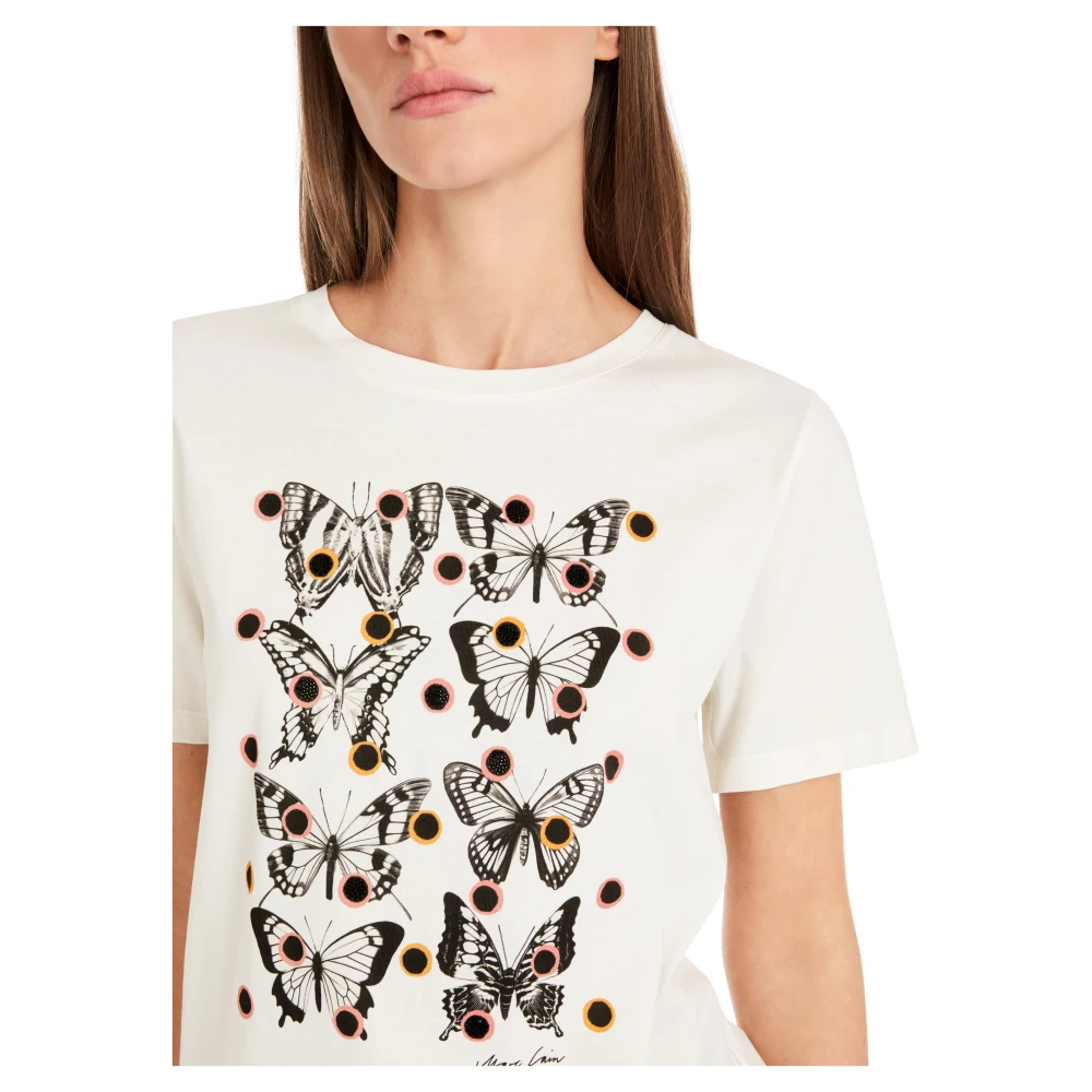 Marc Cain dames T-shirt met vlinder- en stippenprint aan de voorkant. Dit aansluitende shirt heeft driekwart mouwen, een ronde hals en is gemaakt van comfortabele biologische katoen. Het model is 179 cm lang en draagt maat N3/38