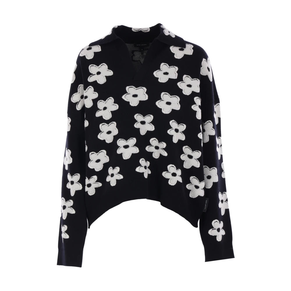 Upgrade je stijl met deze Marc Jacobs V-hals gebreide trui in het zwart, met een contrasterend jacquard Daisy-patroon. Gemaakt van rekbaar viscose materiaal, heeft het een polokraag, lange mouwen, geribbelde randen en een rechte zoom. Internationale standaardmaat; de maat op het label is de aanbevolen pasvorm. Stofsamenstelling: 93% Viscose, 5% Spandex, 2% Meta.