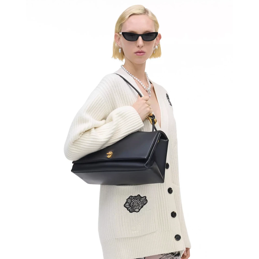 The Marc Jacobs handbag in black is a premium accessory designed for the discerning woman. Featuring a sleek and structured silhouette with a polished finish, it embodies elegance. A sophisticated gold-tone clasp on the front adds a luxurious touch, while the single slim strap with a gold buckle detail enhances its chic appeal. This minimalist and versatile design ensures timeless sophistication for any occasion