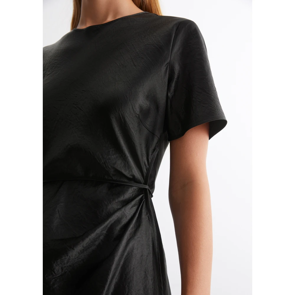 Het valt op! De jurk is gemaakt van de hoogwaardige, innovatieve cellulose gesponnen vezel Naia, acetaat voor kort. Enerzijds dankzij de coole gekreukelde look, en anderzijds dankzij het perfecte en verfijnde snit en lijnen. De jurk heeft een vrouwelijke ronde hals, losse, korte mouwen, een smalle top met strikdetail in de taille en een licht uitlopende rok met een wikkellook. Hij is niet gevoerd en sluit bij de hals met een knoopsluiting. Let op: satijnen jurken zijn delicater dan katoenen jurken. 100% acetaat x x zeer voorzichtig wassen op koud, niet bleken, niet in de droogtrommel drogen, matig strijken, voorzichtig chemisch reinigen