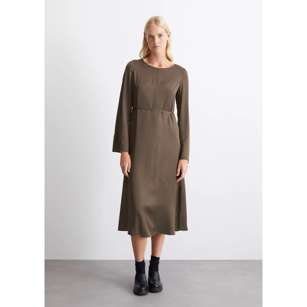 Jurk van Marc O'Polo. Look: effen. Pasvorm/model: Shaped fit. Lengte: Midi. Hals: Boothals. Details: Strikceintuur, zijsplit. Sluiting: knoopsluiting met n knoop. Mouwvorm: lange mouwen. Mouwboord: met split. Materiaalverwerking: Satijn. Materiaal: Viscose. Totale lengte bij maat 36: 124 cm. Borstomvang bij maat 36: 44 cm. Schouderbreedte bij maat 36: 43 cm. Mouwlengte bij maat 36: 63 cm