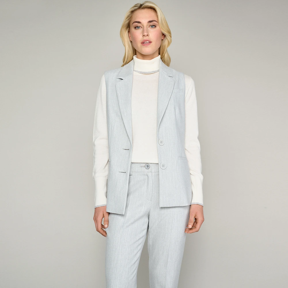 Upgrade je stijl met onze mouwloze grijze blazer van Marie Mro. Deze trendy item combineert moeiteloos stijl en veelzijdigheid en is perfect te combineren met een ecru-kleurige coltrui voor een verfijnde look.
