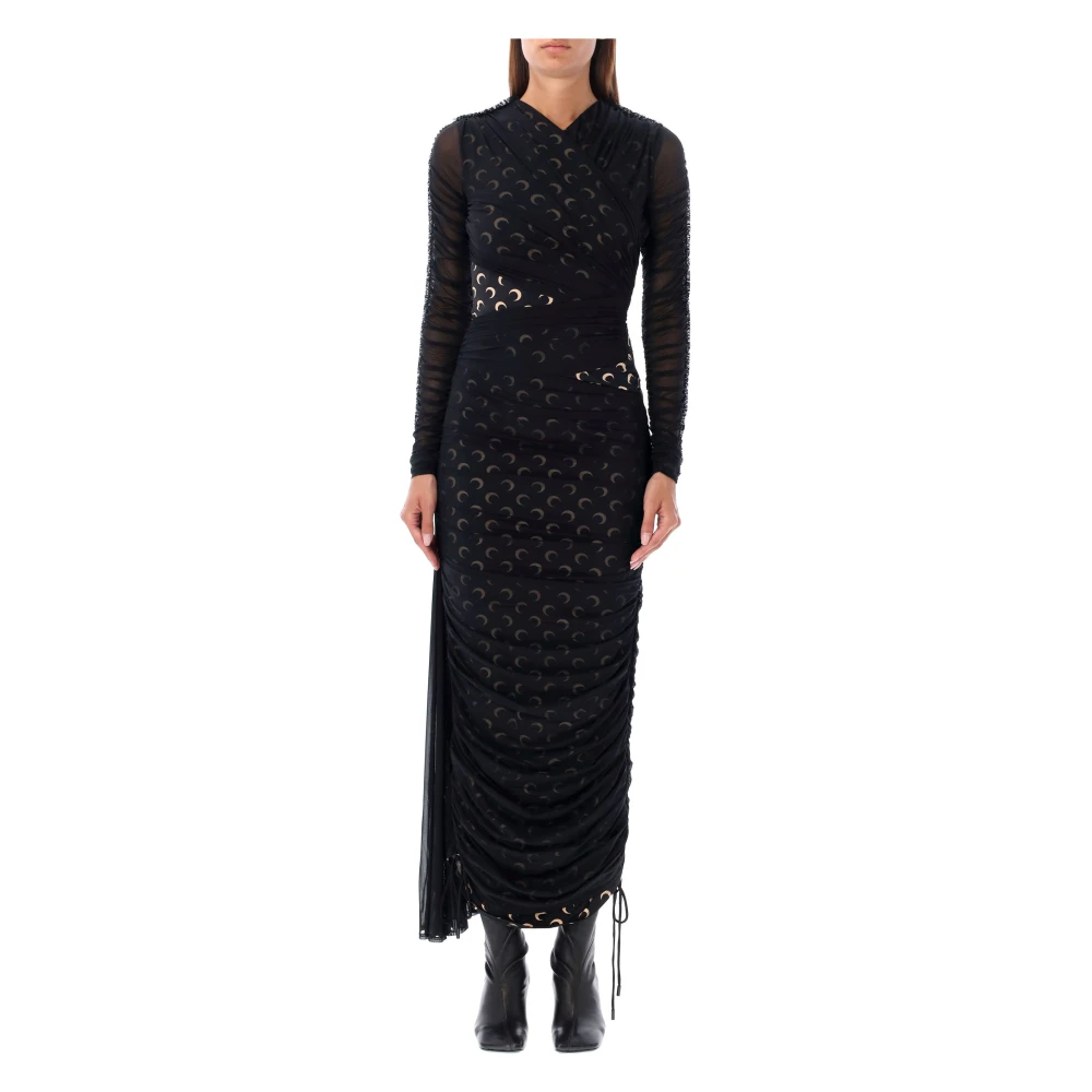 fuchsia stretch design gedrapeerd design vierkante hals mouwloos ruchedetails maanprint aan de achterkant gedrapeerde rug asymmetrische zoom gedeeltelijk gevoerd ritssluiting aan de zijkant