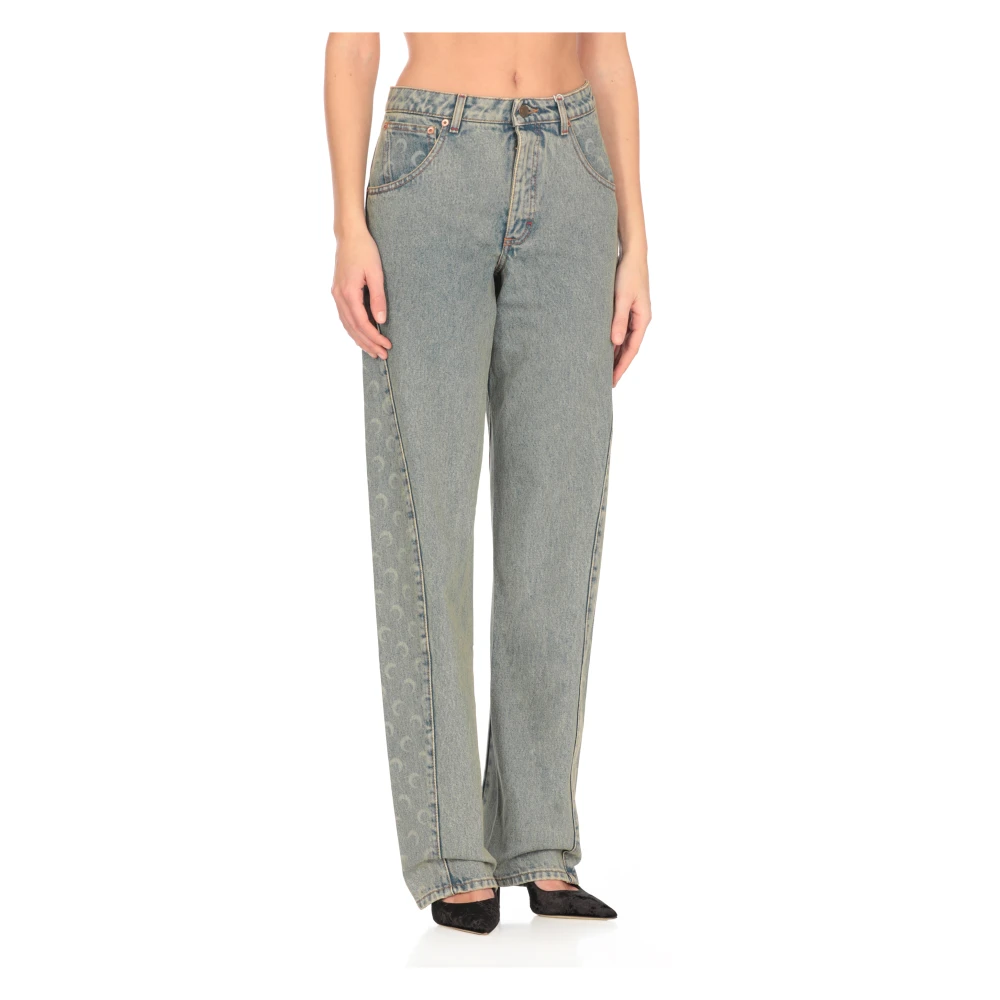 Upgrade je denim look met deze lichtblauwe Marine Serre katoenen wijde jeans voor vrouwen. Voorzien van riemlussen, vijf zakken, achterzijde Moon-logo, achterzijde logo-patch, en voorrits- en knoopsluiting. Model is 179 cm lang en draagt maat 36.