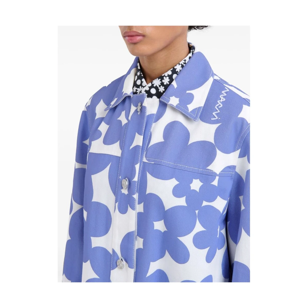 Upgrade je stijl met deze lichte Marni-jas voor vrouwen met een paars en wit katoenen bloemenprint overal. Deze klassieke kraagjas heeft een knoopsluiting aan de voorkant, geborduurd logo aan de zijkant, lange mouwen, twee zijzakken, geknoopte manchetten en een rechte zoom.