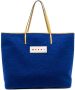 Koningsblauw, veelkleurig, kalfsleer, katoenen voering, omkeerbaar, vilten effect, contrasterende afwerking, logopatches aan de voorkant, verticale strepen, twee lange handvatten, logopatch aan de binnenkant en binnenzak met ritssluiting.