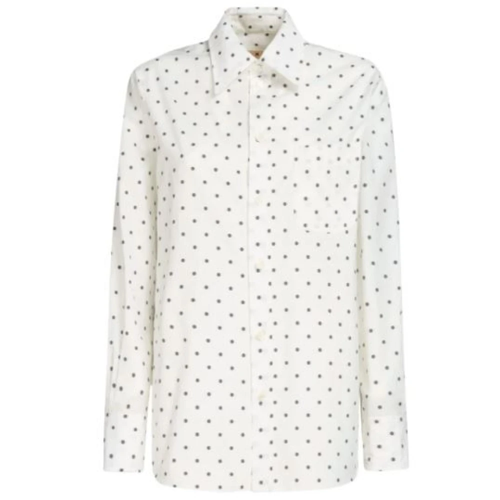 Voeg een vleugje elegantie toe aan je garderobe met deze Marni blouse van katoenen popeline met stippen. Met een klassieke kraag, knoopsluiting en borstzak is deze blouse versierd met een afgeronde zoom en een geborduurd Marni-logo aan de achterkant van de kraag. Gemaakt in Italië van 100% geweven katoen, is deze blouse een tijdloze toevoeging aan elke outfit.