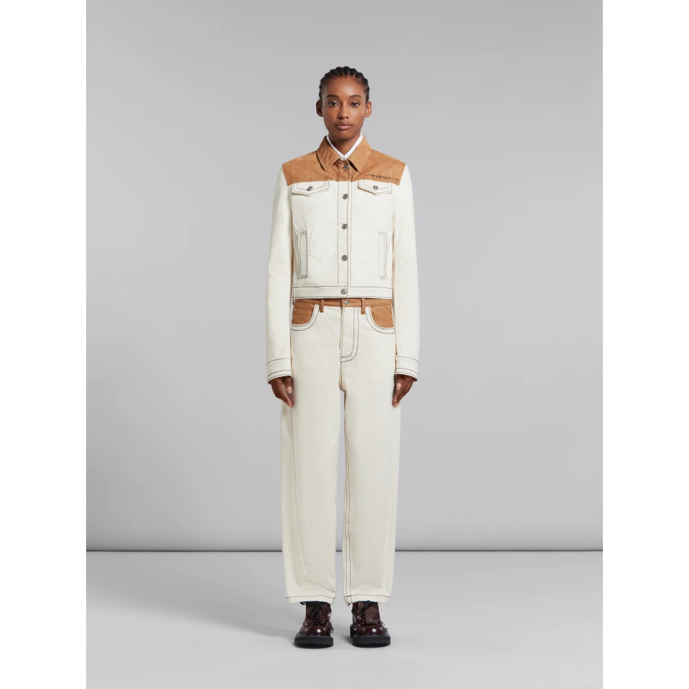 Truckerjack van biologische denim met juk van geverfd stof en contrasterende naden. Normale pasvorm, klep- en paspelzakken. Met de hand geborduurd Marni-patchlogo met bloemendetail op het juk. Leren logopatch op de achterkant