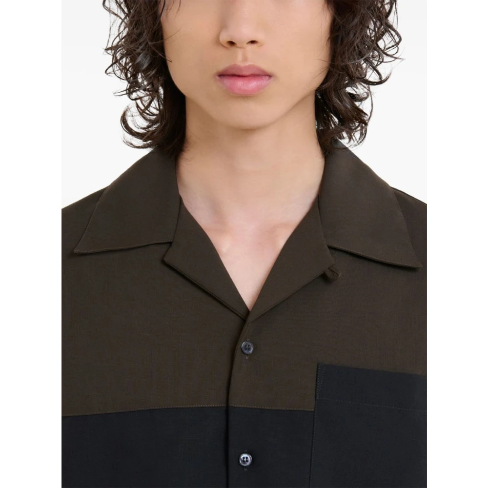 Upgrade je garderobe met deze Marni korte mouwen overhemd in zwart en bruin. Gemaakt van maagdelijke wol crepe, het heeft een getextureerd paneel ontwerp, inkeping kraag, knoopsluiting aan de voorkant en rechte zoom. Dit stuk past op maat. Model is 1, 84m / 6ft 1in en draagt maat 48 (It).