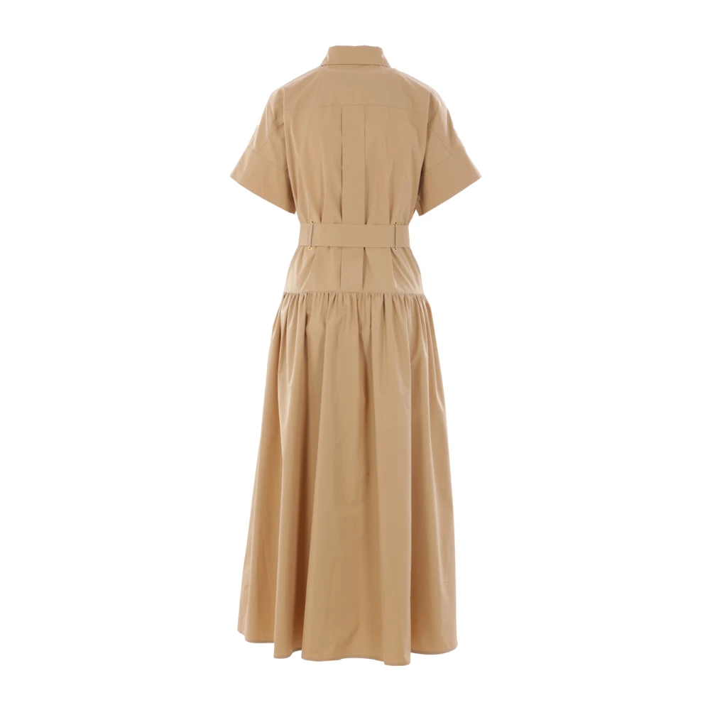 Upgrade je garderobe met deze Max Mara midi-jurk van zandkleurig katoenen popeline. Voorzien van een kraag in overhemdstijl, verborgen knoopsluiting aan de voorkant, korte mouwen met knoopmanchetten, metalen ringlussen / bijpassende riem en een A-lijn rok. IT-maat; de aangegeven maat is die op het productlabel. Normale pasvorm, valt op maat.