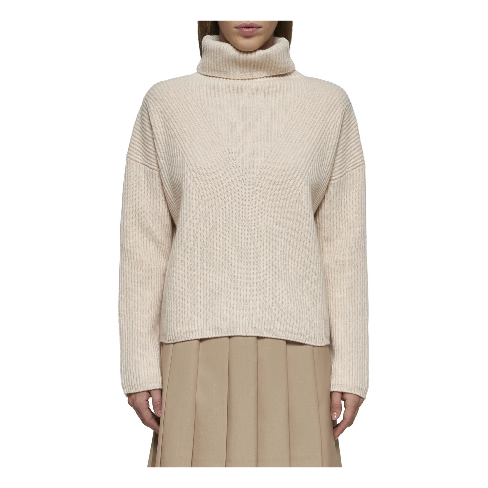 Upgrade je wintergarderobe met de Golia coltrui van Max Mara Studio in beige geribbeld wol en kasjmier breisel. Deze coltrui voor vrouwen heeft verlaagde schouders en geribde randen, perfect voor een gezellige en stijlvolle look