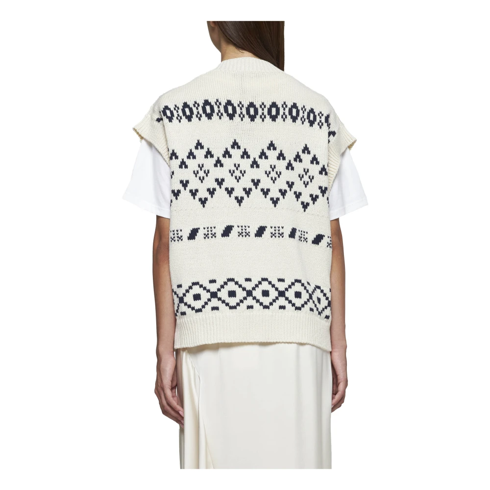 Oversized gilet gemaakt van zacht katoengaren, verfraaid met een Noors jacquardpatroon. Dit losvallende model heeft een V-hals en geribbelde afwerkingen. Normale lengte