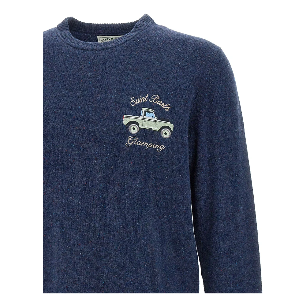Upgrade je stijl met deze heren Mc 2 Saint Barth Donegal Pickup wollen trui in het blauw uit de Country Club Collection. Deze trui heeft lange mouwen, een ronde hals, geribbelde boorden en een maxi 'Saint Barth Glamping' borduursel op de borst. Het heeft een regular fit, perfect voor een verfijnde look.