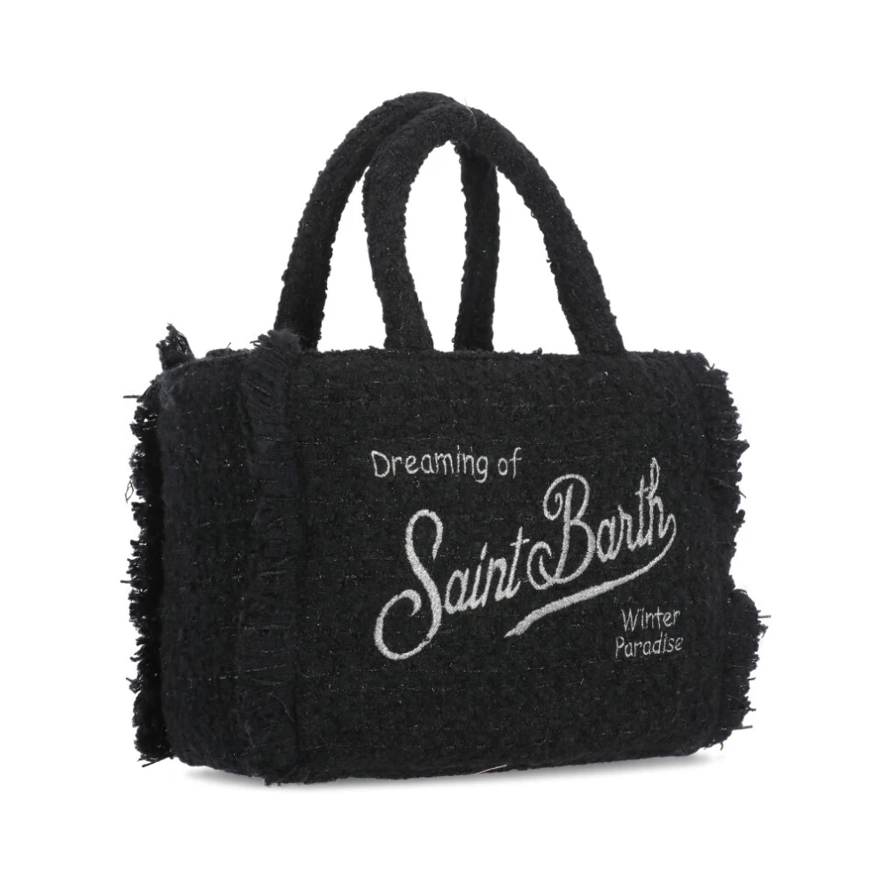 Upgrade je stijl met deze zwarte St. Barth handtas van wolmix voor vrouwen. Voorzien van twee handvatten, ritssluiting, twee interne zakken, verstelbare en afneembare schouderriem, voor- en achterkant met contrasterend geborduurd logo, lurex details overal en franjes aan de randen. Afmetingen: H22 x L30 x D12 cm. Handvat drop: 13 cm. Schouderriem drop: 50 cm