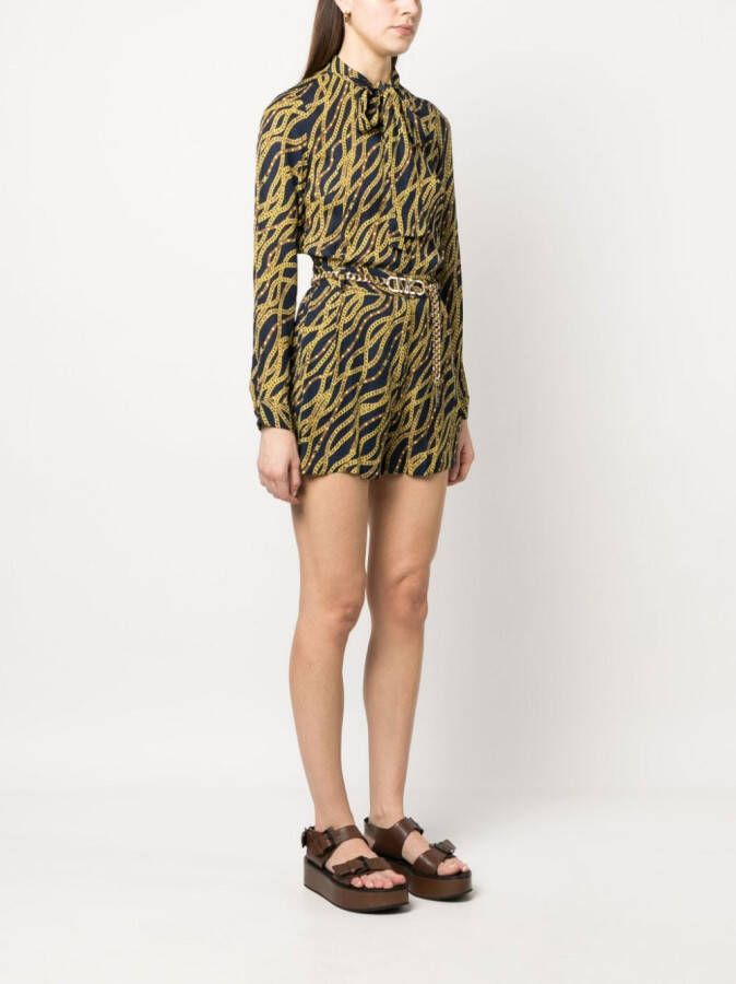 Nachtblauw, geel, schakelkettingprint, goudkleurig logo, strikkraag, knoopsluiting aan de voorkant, taille met ceintuur, lange mouwen, knoopmanchetten en dijlengte