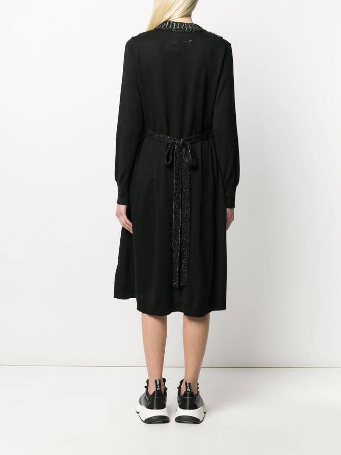 Jurk met vlak van MM6 Maison Margiela US voorzien van geribbelde v-hals, lange mouwen, geribde manchetten en knielengte.