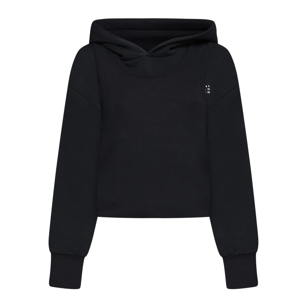zwart katoen jersey textuur kenmerkend gestikt logo ruche details ronde hals verlaagde schouders lange mouwen geribbelde manchetten en zoom