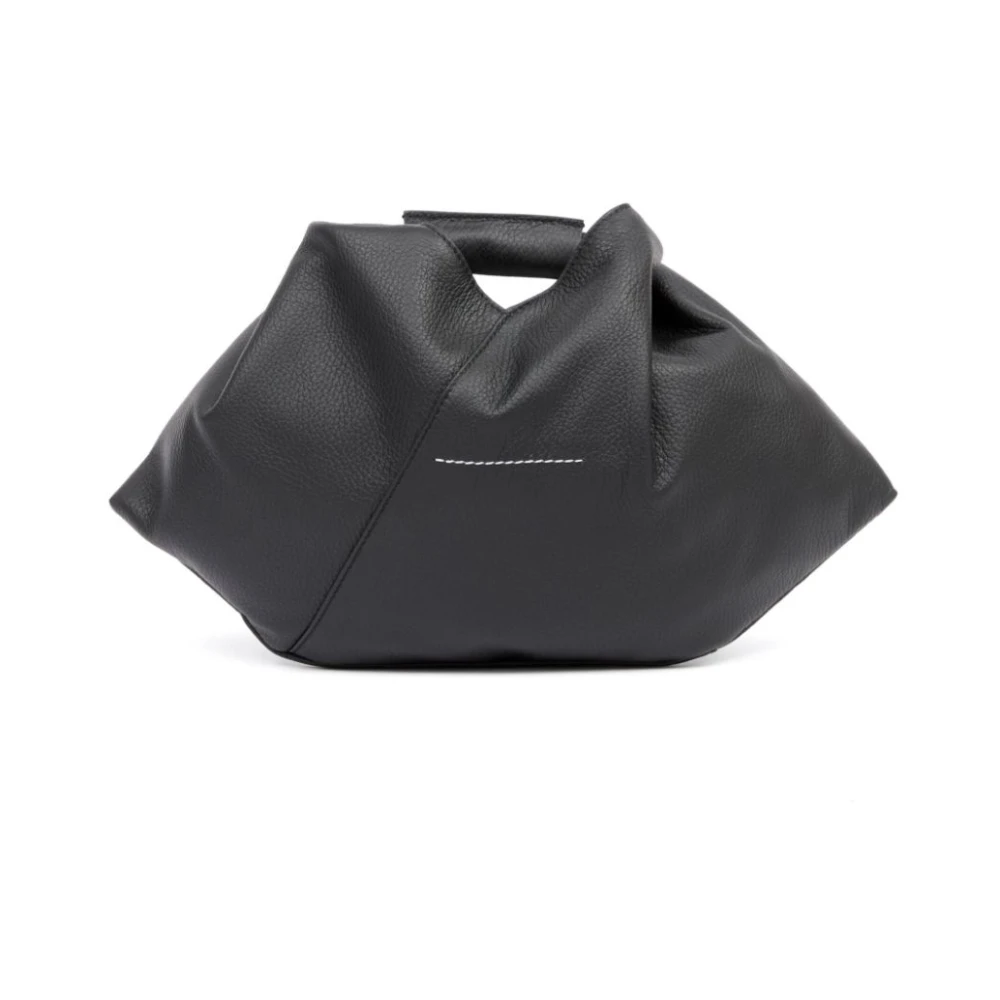 Upgrade je stijl met deze MM6 Maison Margiela handtas in zwart kalfsleer met een gedrapeerd ontwerp, gevouwen riem en drukknoopsluiting. De enkele gerolde bovenste handgreep, kenmerkend cijfermotief en enkele stiksel logo voegen een vleugje verfijning toe aan het hoofdcompartiment.