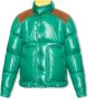Groene 'Ain' donsjas van Moncler. Afgewerkt met bruin ribfluweel, dit ontwerp heeft drukknopen, een tweewegritssluiting, een mouwpatch met een logo, een opstaande kraag met een verborgen capuchon, twee met drukknopen afsluitbare zakken en lange mouwen met elastische, verstelbare manchetten. Afmetingen van het model Lengte: 193 cm Borst: 95 cm Taille: 82 cm Heupen: 93 cm Het model draagt maat: 3